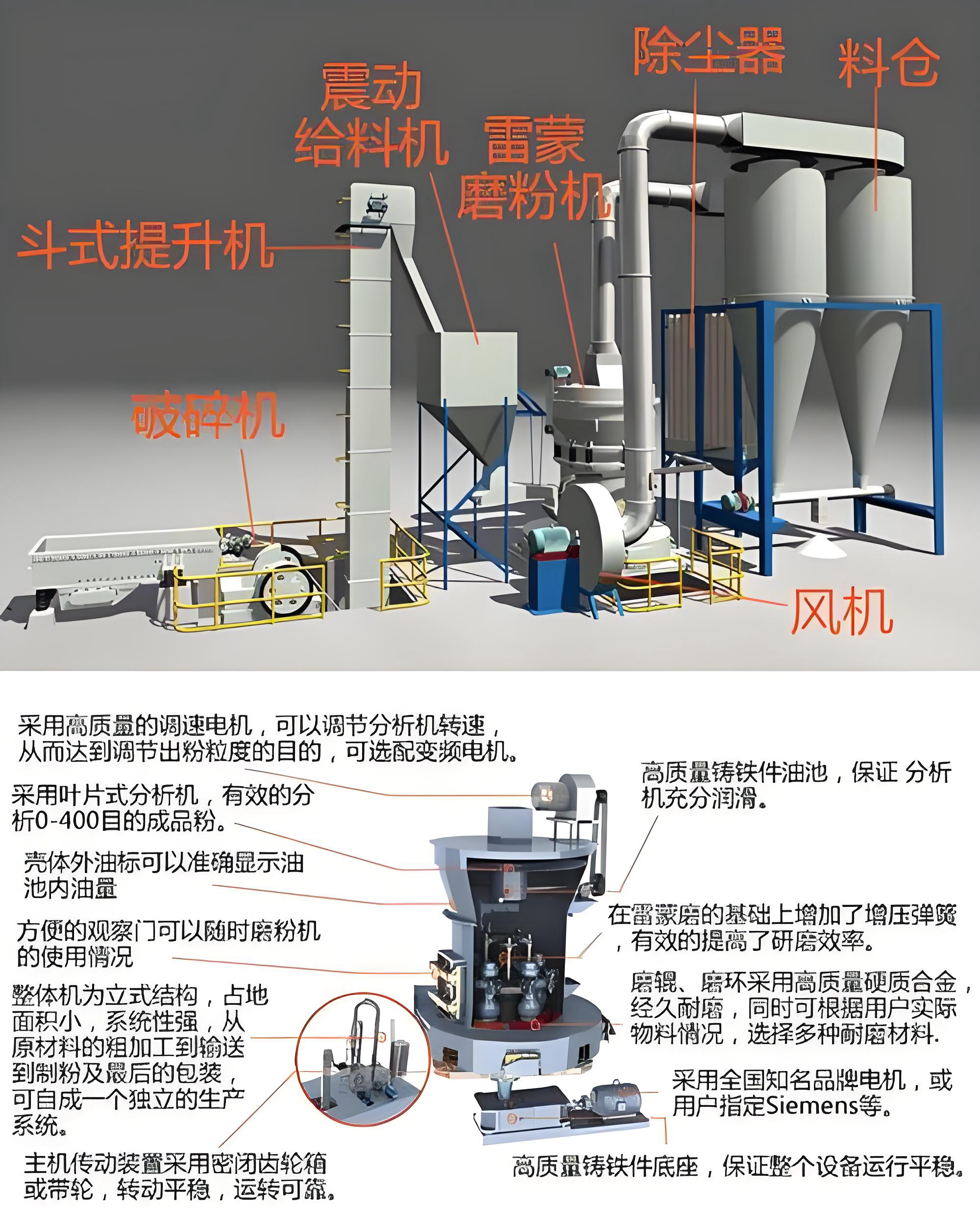 技术成熟,运行稳定:雷蒙磨是一种非常经典的磨粉设备,技术发展历史悠久,结构可靠,故障率相对较低,能够满足大规模连续生产的需求。